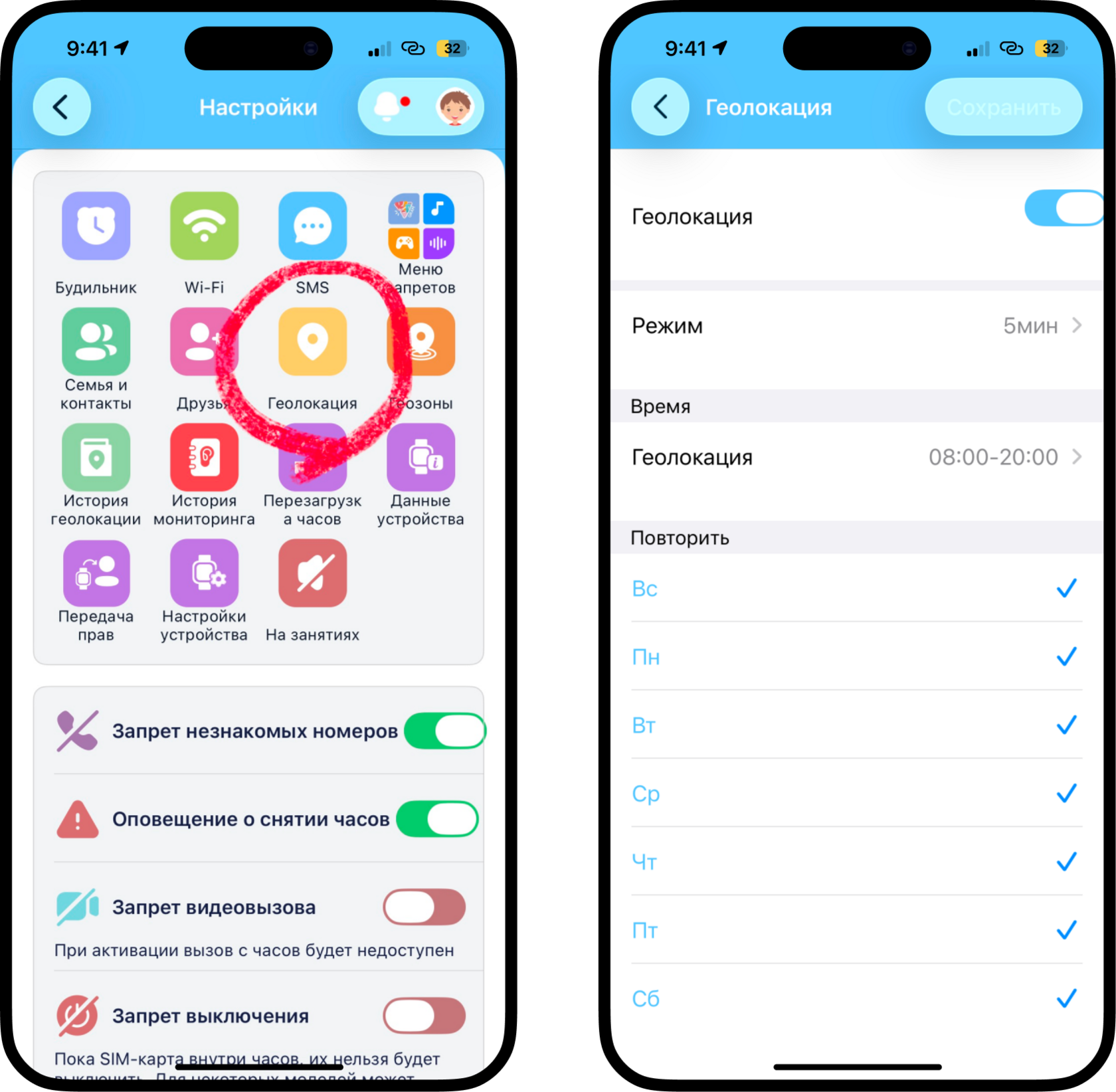 Повторить: В данном пункте Вы можете выбрать дни недели для отправки информации о местоположении часов, на примере: местоположение часов будет передаваться каждый день.